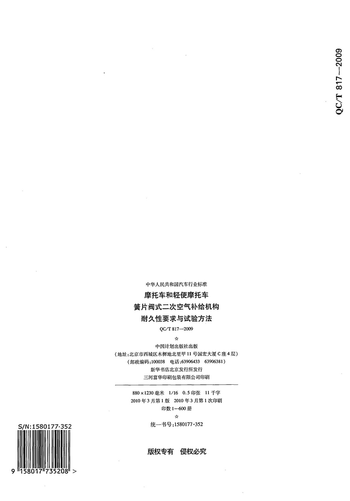 《摩托車和輕便摩托車簧片式二次空氣補給機構耐久性要求與實驗方法》QCT817-2009