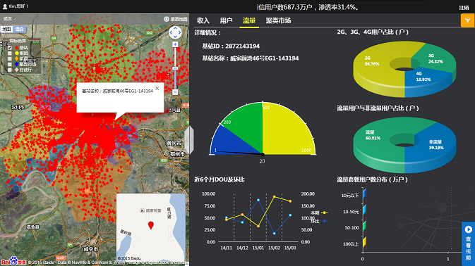 武漢移動基于已有的大量基站,集團客戶,營業廳等各項指標的地理信息,結合億信BIGIS應用,實現了地圖上40000多個基站數據點的標注。平臺利用億信BI,將基站、營業廳已有的GPS坐標換算成百度坐標,使其可以在百度GIS上進行精準的標注。再在平臺頁面中,通過百度GIS地圖上的數據點的標注,以直觀的密集度呈現出武漢市區域范圍內基站以及營業廳等指標的分布情況,輔助領導進行決策。