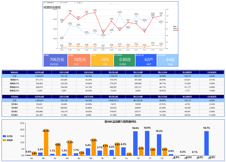 2、商品結構管理:各零售藥店每月商品銷售情況,包括品單價、品項占比、銷售占比、價格帶、雙ABC、品類效益、理論與實際、關聯率、微定價等等。