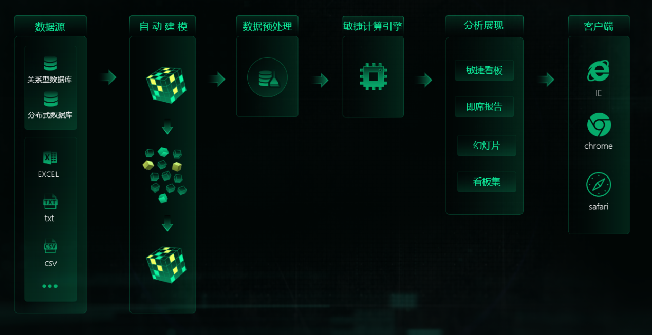 支持基于列存儲的MPP架構的分布式數據庫進行敏捷分析,百億數據可達到秒級響應,給用戶帶來極致的產品體驗,可解決TB甚至PB級超大數據量敏捷分析的難題。