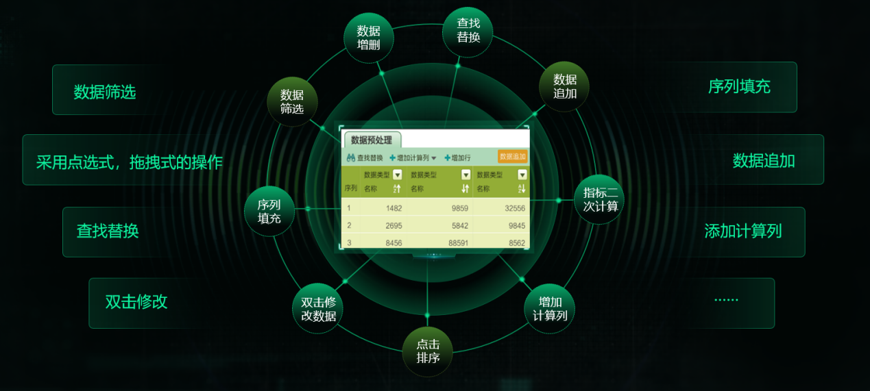 對于接入系統的數據,通過點選式的方式進行去除重復行、空值替換、數據裁剪、數據脫敏、類型轉換等復雜的數據處理操作,并且能進行圖形化界面多表關聯。