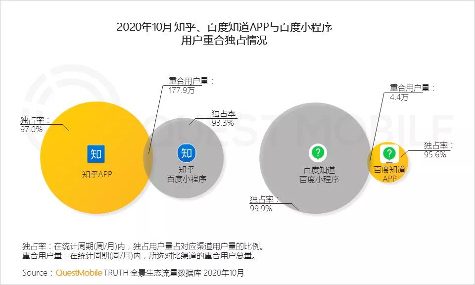 除了同一個app獨占率自己的對比, 同種類型的app的獨占率還做了對比. 比如百度知道app 獨占率 95.6%, 宣布內(nèi)附知乎app 獨占率(97.0%)略低。但百度小程序的獨占率(99.0%)要大大高于 知乎小程序的獨占率 93.3%。