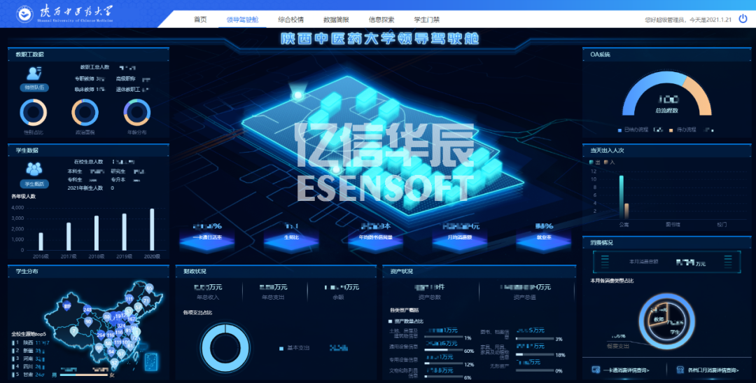 陜西中醫藥大學是一所以中醫藥專業為主體,醫、理、工、文、管多學科專業相互支撐、交叉融合的醫科類院校。其數字化工作一直走在高校前列,近年來啟動智慧校園建設。但一直以來數據缺乏良好的展示平臺,陜西中醫藥大學選擇與聯奕合作,利用數據分析軟件億信ABI有效打通信息收集和展示的鏈路,構建一個可視化、自動化的數據管理平臺。 那么,就具體的場景而言,一站式數據分析平臺億信ABI是怎么發揮作用的呢? 為什么需要數據化運營 高校信息化的建設與發展不斷更新迭代,已形成了“人、財、物”為管理對象的各種業務管理系統,也因此積累了海量的業務數據。但傳統的各業務系統建設或多或少都有各自的數據分析與展示后臺,由于系統之間的壁壘,數據無法實時共享,導致數據的分析展示作用、查看權限受限。 智慧校園場景化落地實戰 陜西中醫藥大學利用億信ABI建設了統一的校情綜合分析平臺,涉及內容包括首頁、領導駕駛艙、綜合校情、數據簡報、信息探索和學生門禁等各項內容。通過數據化運營改進數據收集和管理方式,用數據驅動業務,對業務數據進行可視化分析,以提升學校管理水平和服務能力。 輕松整合異構數據源 傳統的學校教務人員如果需要做數據分析,需要操作多個不同異構系統,不僅涉及系統繁多,工作量大,而且工作內容復雜,差錯容忍度低。單純依靠人工操作,不僅效率多,耗費大量人力,還易產生數據誤差。億信ABI可從多個系統、數據源獲取數據,支持多種數據庫連接,還可以輕松整合多個業務系統的數據,打破信息孤島,進行綜合展示分析,讓決策更清晰。 領導駕駛艙運營管理多元化 領導駕駛艙以駕駛室的方式,根據詳細的評價指標體系,將收集的數據信息根據各種各樣普遍的數據圖表(3D地圖、柱狀圖、折線圖、餅狀圖)藝術化、形象化、細化,即時體現學校運作的重要指標值,形象化的檢測學校運行狀態,供學校領導層按時匯報工作。