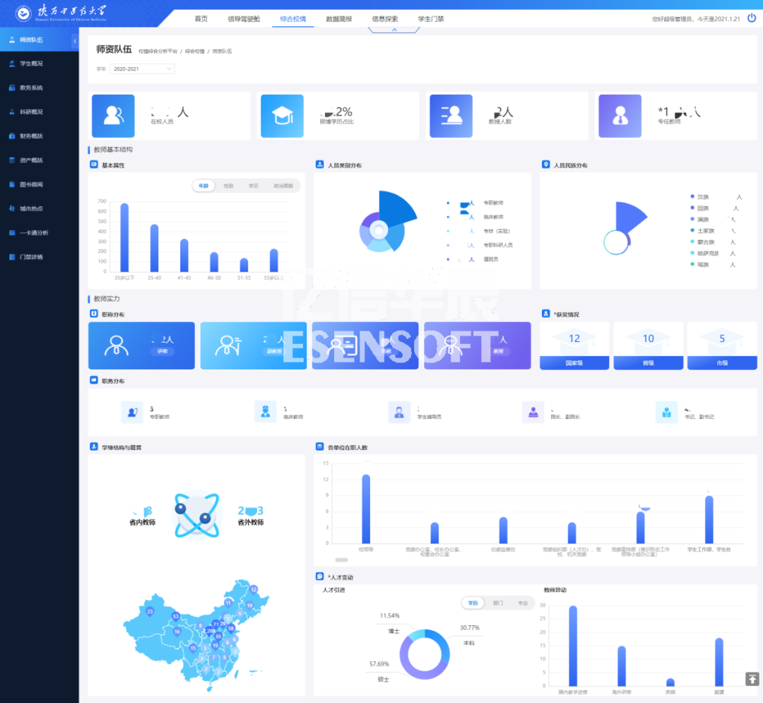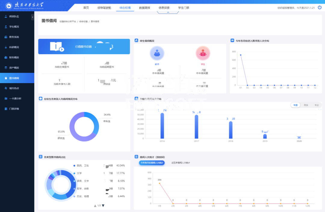 豐富的校情可視化數據看板 在綜合校情查詢與主題分析角度,對教務教學、科研、資產、財務、人事與學生管理、一卡通等業務,進行結構、趨勢、分布等綜合分析,讓各級領導一屏在手,掌握全局,多種指標實時隨地呈現,助力科學決策。 師資隊伍 高校師資隊伍建設的優劣決定了高校人才培養質量的高低。如何在大數據時代科學利用源于高校各個層面的海量數據,并使之成為高校師資隊伍建設的參考與方向,是眾多高校需要解決的問題。師資隊伍頁面通過展現教職工主要的屬性指標,分析了目前高校師資隊伍建設中所存在的問題,對加強高校師資隊伍建設起到指導作用。如下圖: 學生概括 學生概括展現出學生的基本屬性、人數分布、學籍情況、借閱與消費、畢業與就業等指標。如下圖: 資產分析 強化資產管理是推進預算制度改革的重要內容,也是部門預算有效執行的重要保證。資產概括頁面通過分析學校各類型資產的存量和分布情況,可以提高資產的利用率,從而指導探索進一步管好用好高校資產的方法與途徑。如下圖: 圖書借閱 對陜西中醫藥大學圖書館館藏圖書的種數、冊數,以及圖書借閱率,不同用戶群借閱情況進行了統計,通過對統計數據的分析找出了圖書流通的一般規律,為今后館藏資源的配置、布局以及流通閱覽服務工作的完善提供參考。如下圖: 一卡通分析 一卡通分析頁面通過對全校師生消費和卡片進行分析,可以讓學校管理者對在校師生的消費情況和規律有一個量化的認識,從而能夠合理地分配資源,降低管理成本,這對校園的規劃建設和學校學生管理工作都具有重要的作用。如下圖: 多層級的權限管理 億信ABI搭建的校情綜合分析平臺,系統主要分五種類型用戶:學校領導、行政部門領導、教學部門領導、行政部門老師和教學部門老師。用戶根據不同的角色具有不同的權限 ,看到的信息也不同。